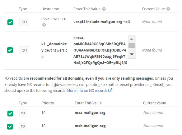 You will now need to add some DNS records to your domain in order to verify it. Follow the instructions provided by Mailgun for your particular host.